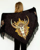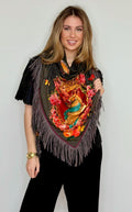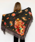 Discover the enchanting Angeni XL shawl, a luxurious piece that merges art with elegance. Featuring stunning poetic illustrations of angels set against a sophisticated dark grey backdrop, this oversized scarf becomes a wearable canvas.The piece is finished with soft grey artificial suede fringe and decorative zigzag trim, creating movement and texture. Perfect for layering, draping, or making a bold fashion statement, the Angeni shawl transforms any outfit into something truly celestial. fabric 96% viscose/4%lycra