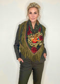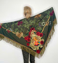 This XL scarf combines bold style with divine inspiration, featuring an image of Mary framed in gold, set against a striking camouflage background embellished with red roses and leopard print. Finished with army green fringes and a distinctive zigzag trim,...