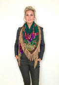 The XL-scarf Laila features a stunning floral design inspired by a Chinese vase, complemented by two elegant panthers and a graceful crane against a rich green background. Crafted from a soft blend of 96% lycra and 4% elastane, it offers both comfort and stretch. Finished with luxurious artificial fringe and a chic zigzag trim, this scarf adds a sophisticated and bold touch to any outfit.