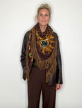 Discover timeless elegance with this oversized XL shawl, featuring Mary's serene portrait framed in lustrous gold against a striking leopard print backdrop. Rich autumn hues blend seamlessly with ornate Renaissance-inspired golden accents, creating a sophisticated statement piece. Perfect for layering with effortless style, this luxurious scarf elevates any ensemble with its artistic flair and refined aesthetic. Wrap yourself in luxury and artistic expression. fabric: 96% viscose/4% lycra