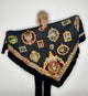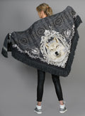 This versatile Boucle Yaholo shawl features two stylish sides: one showcases a striking white wolf adorned with elegant jewelry framed in silver, while the reverse offers a soft grey boucle fabric. Finished with a refined grey Italian fringe and an Aztec-inspired band, it elevates any outfit with unique texture and artistic detail. Perfect for fashion-forward layering, this shawl blends bold imagery with subtle sophistication.