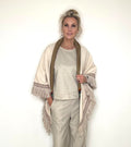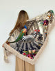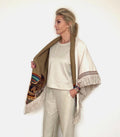 This reversible wrap combines bold artistry with understated elegance. One side showcases a striking panther design styled as an Egyptian Pharaoh framed by pyramids and ancient symbols, adding a unique, cultural flair. The reverse side features a soft off-white boucle fabric, accented with Italian wool fringe and an Aztec-inspired band for refined texture and detail. Perfect for versatile styling, this wrap elevates any outfit with its blend of fashion-forward design and timeless craftsmanship.