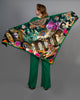 This reversible shawl brings vibrant culture and elegant simplicity together. One side features a colorful design inspired by the Mexican Day of the Dead, adding festive flair to any outfit. The other side showcases a sophisticated army green boucle fabric for a refined, versatile look. Finished with Italian green fringe and an Aztec tape, this shawl perfectly balances boldness and subtle elegance.