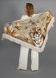 Drape yourself in versatile elegance with this reversible shawl that offers two distinct looks in one piece. Featuring a striking patterned design on one side and a sophisticated plain taupe boucle on the reverse, it adapts effortlessly to your style. Italian wool fringes and aztec tape detailing add artisanal charm and texture, making it the perfect layering piece for any occasion.