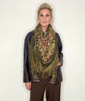 Wrap yourself in autumn warmth with this stunning XL shawl, featuring a captivating zigzag design that showcases a different print in each layer. Rich, seasonal hues blend seamlessly across the fabric, creating depth and visual interest. The shawl is finished with an army green artificial fringe and coordinating zigzag trim that adds a modern edge to this timeless accessory. Perfect for layering over any outfit, this versatile piece transitions effortlessly from day to evening wear.