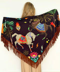 Embrace bold style with this striking XL scarf featuring an enchanting design of galloping horses, blooming flowers, vibrant fireworks, and swaying palm trees set against a dramatic black backdrop. The luxurious piece is finished with soft artificial suede fringe and a decorative zigzag trim that adds movement and texture. Perfect for layering, wrapping, or making a statement, this versatile accessory brings artistic flair to any outfit. A true conversation starter for those who dare to stand out.