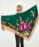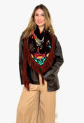 Embrace bold style with this striking XL scarf featuring an enchanting design of galloping horses, blooming flowers, vibrant fireworks, and swaying palm trees set against a dramatic black backdrop. The luxurious piece is finished with soft artificial suede fringe and...