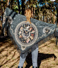 The Zodiac | Grey shawl showcases delicate zodiac symbols surrounding a striking black panther at its center. Crafted with luxurious black artificial fringe and a stylish zigzag trim, this XL shawl adds a bold, celestial touch to any outfit while...